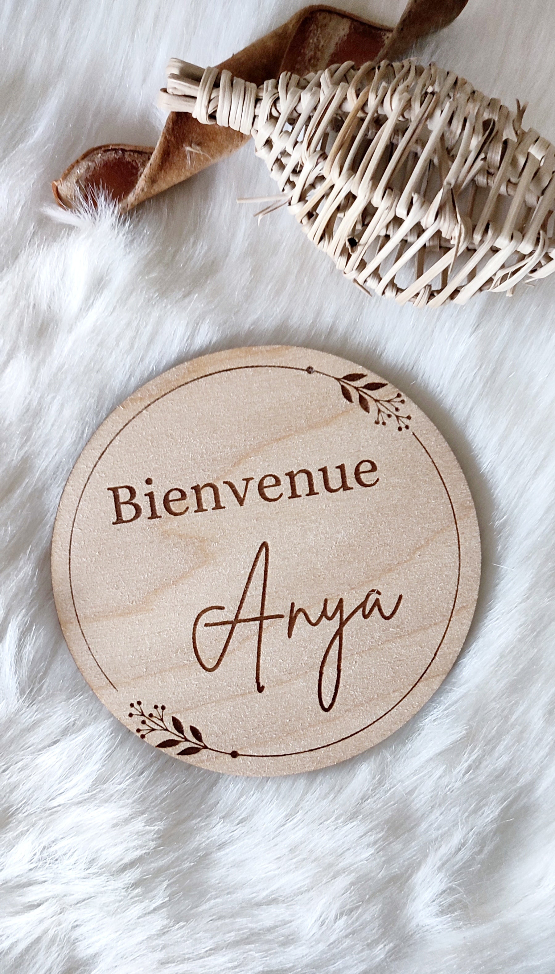 Pour immortaliser la première photo de naissance de bébé voici un joli médaillon de bienvenue avec son prénom.