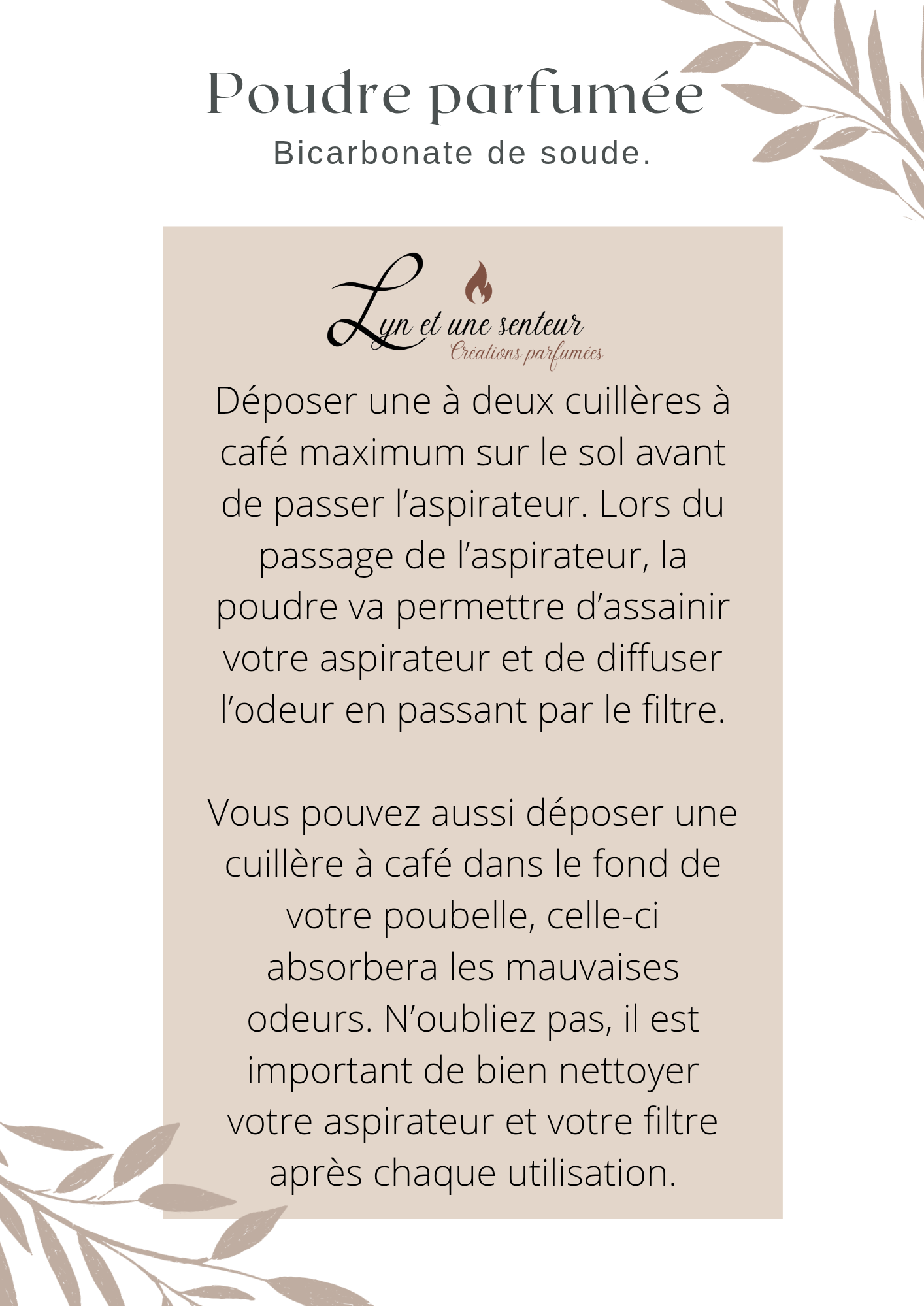 Pour une utilisation optimale, saupoudrer une petite quantité de poudre sur les tapis ou le sol, puis aspirer. Ce procédé parfumera votre aspirateur et votre intérieur.