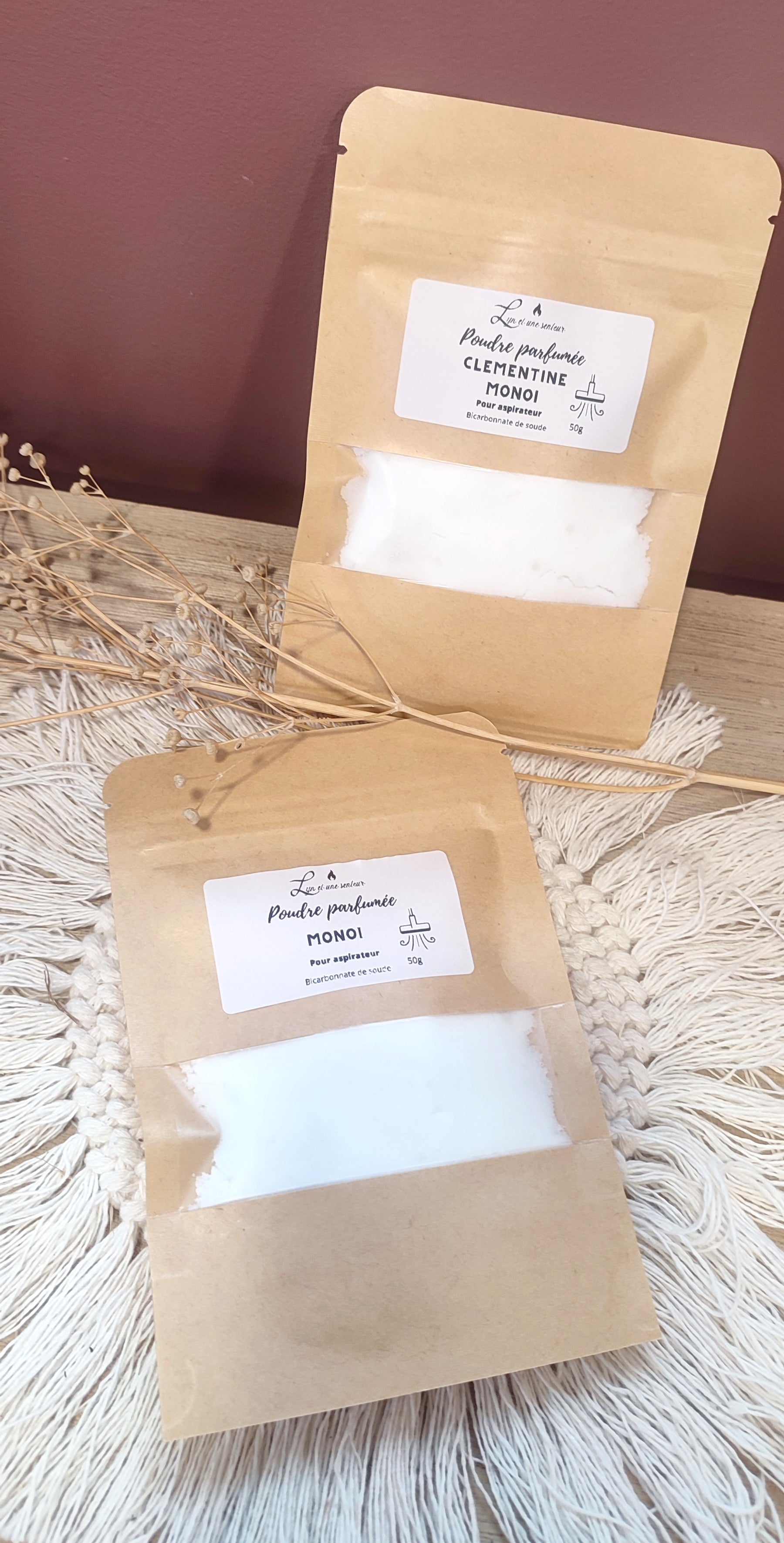Poudre parfumée formulée à partir de bicarbonate de soude et de fragrance, conditionnée en sachets de 50g.