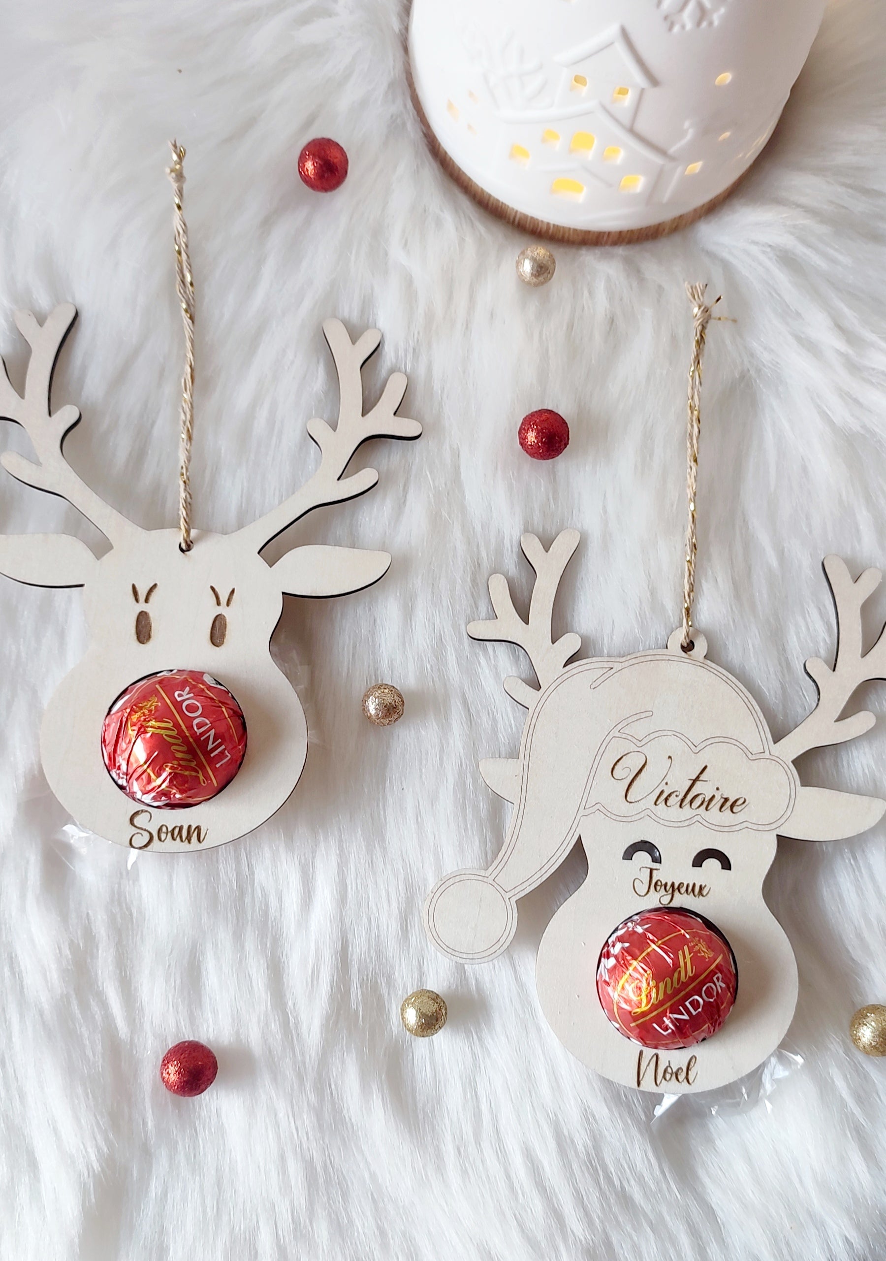 Un joli renne à suspendre dans le sapin avec un nez en chocolat pour ravie les papilles des petits comme des grands.